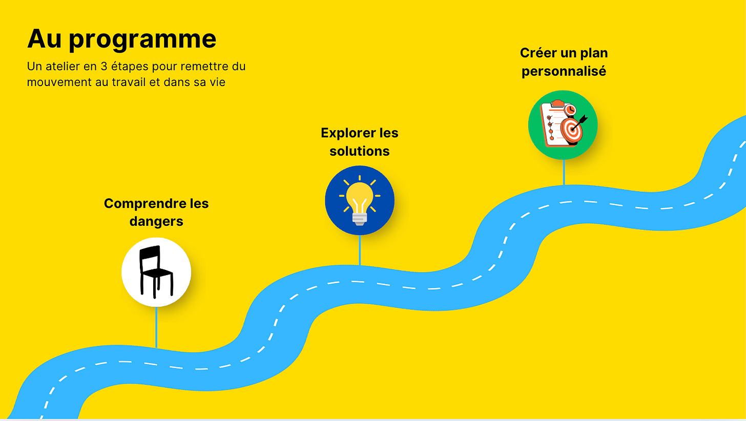 Explorer des solutions : Fruit d’un long travail de recherches, nous partageons des astuces pratiques pour intégrer plus de mouvement dans votre entreprise. Que ce soit par des pauses actives, des aménagements de bureau ergonomiques ou des activités de groupe, il existe plein de façons de bouger ensemble au travail !